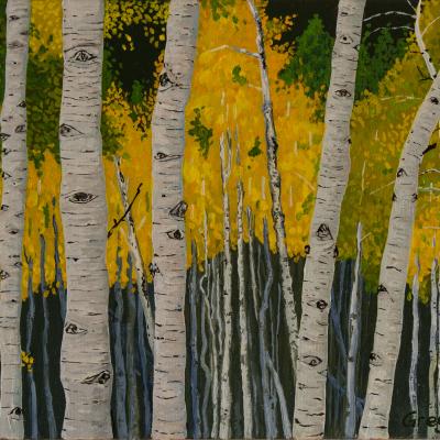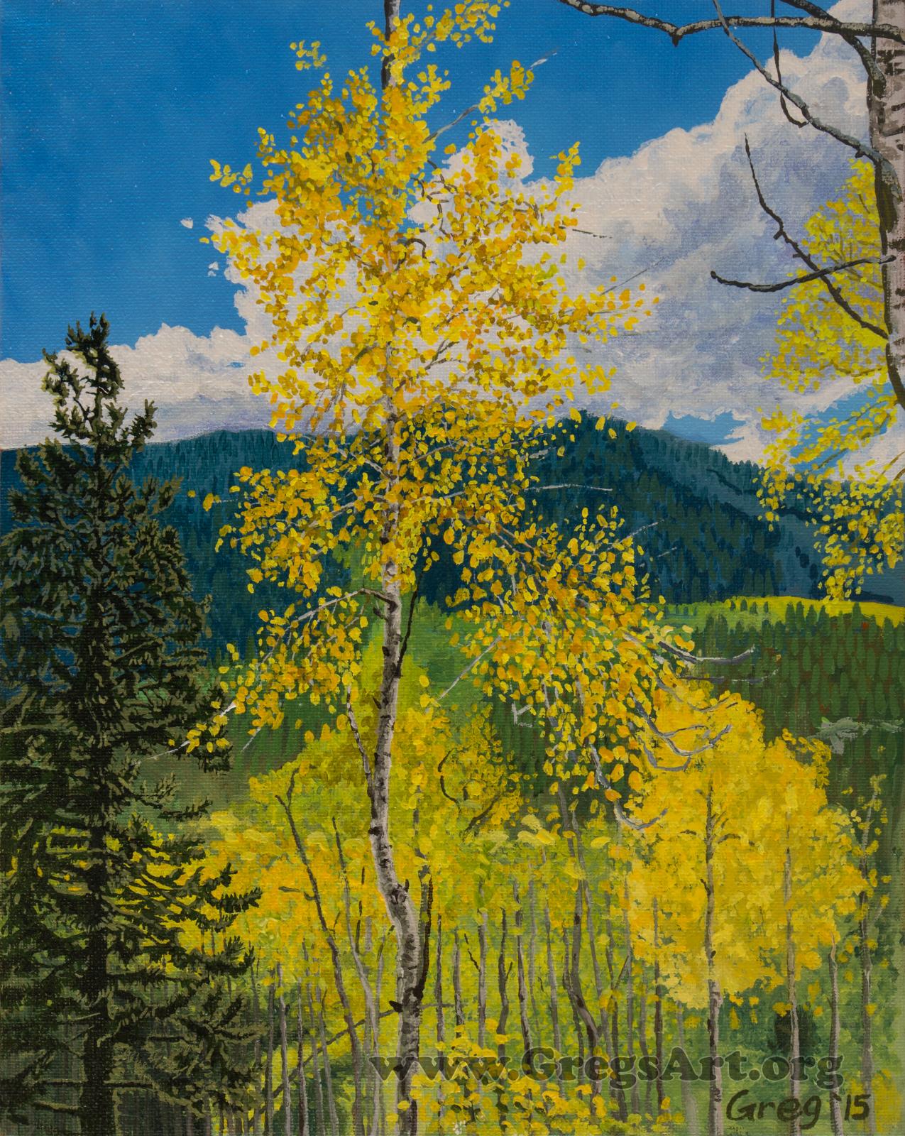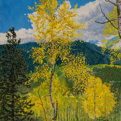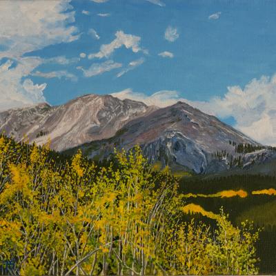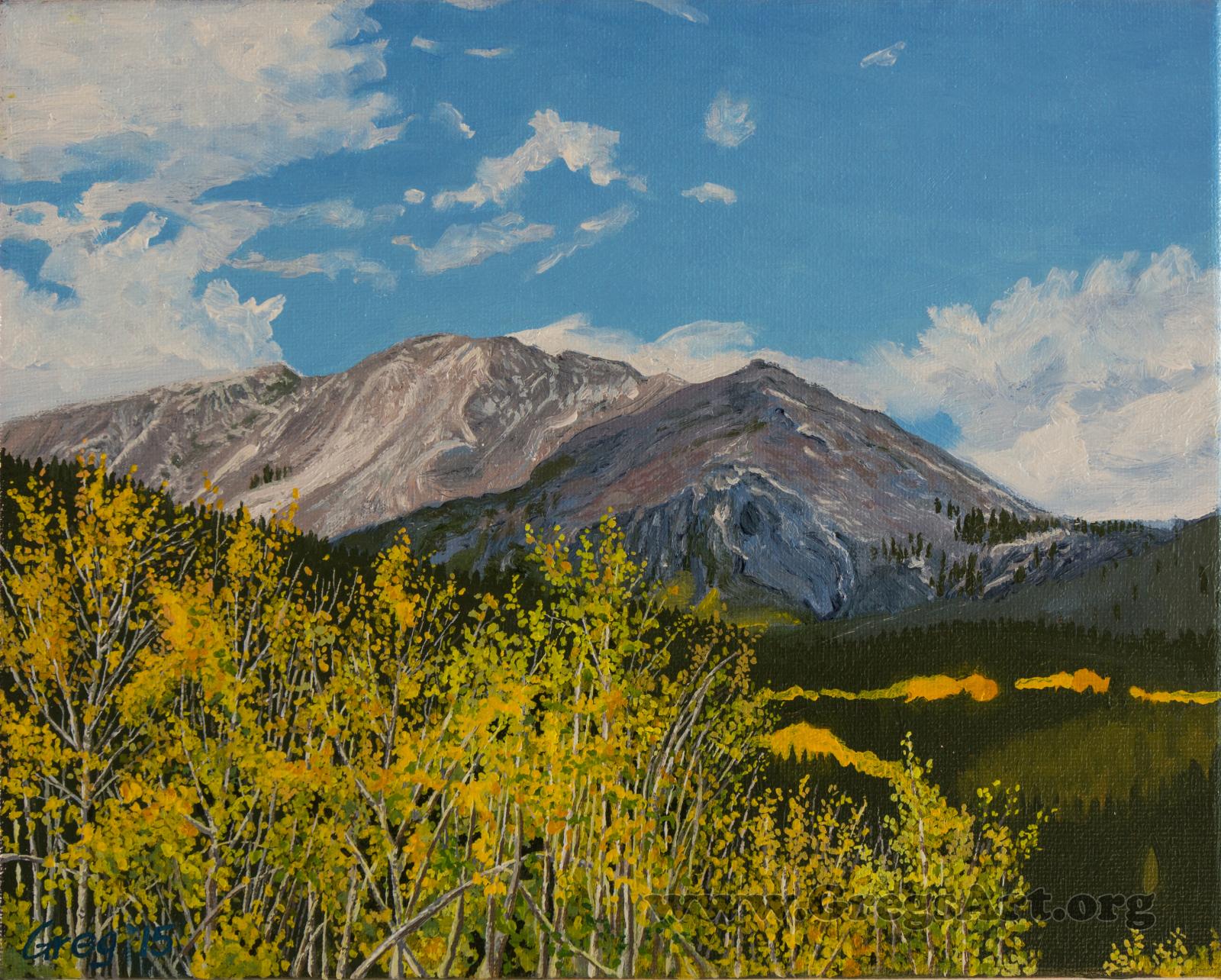 Fall in the mountains is fireworks in slow motion. The backdrop consists of dark greens, grays and blues with bursts of lime green, yellows ranging from Cadmium to Azo and oranges from gold to autumn rust. The massive forests of aspens dotting the Rockies are the west’s version of Vermont’s maples, but at 8000-plus feet.
