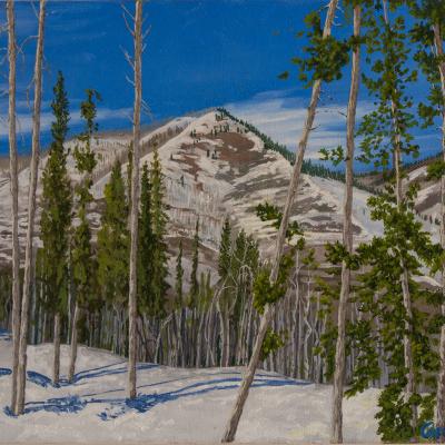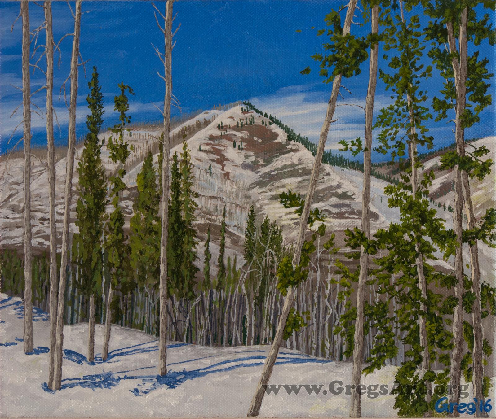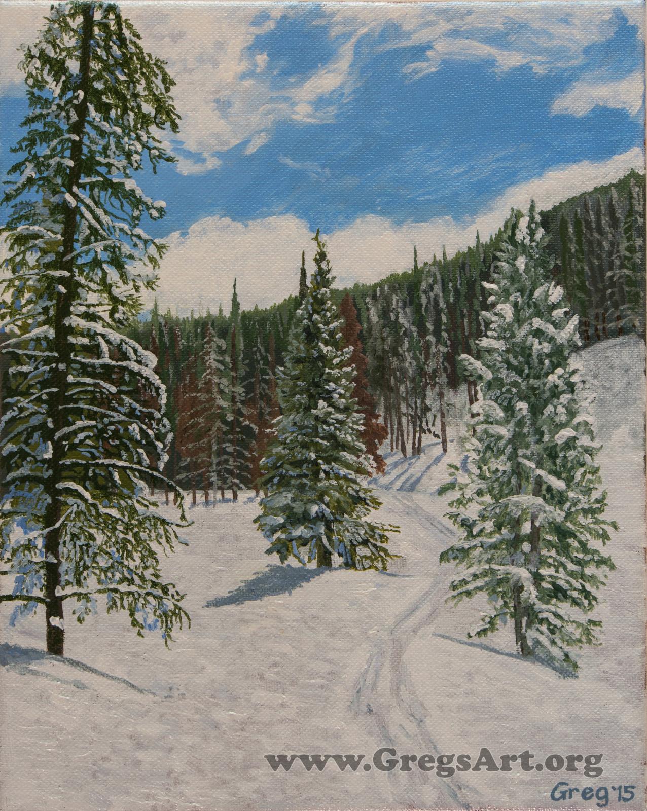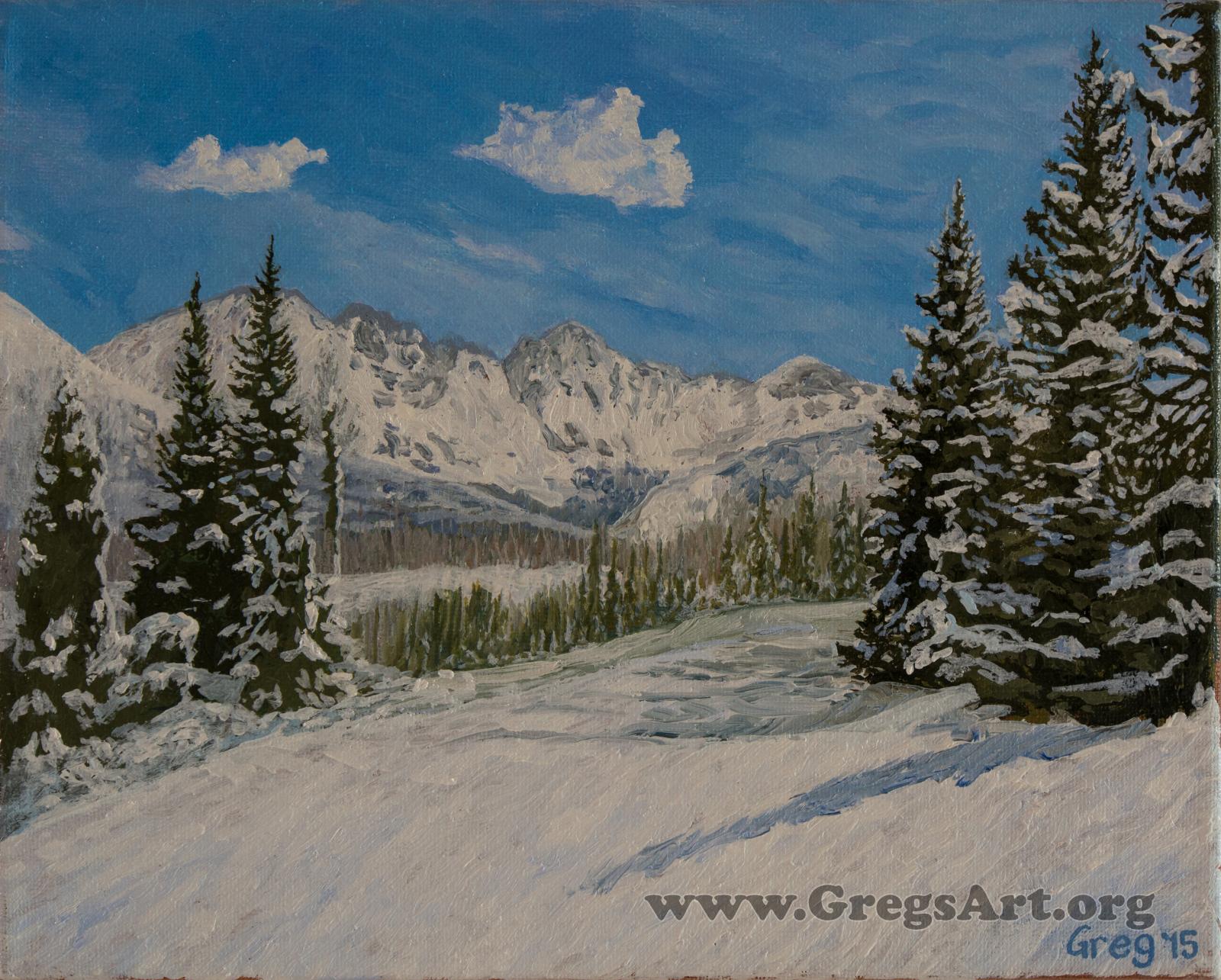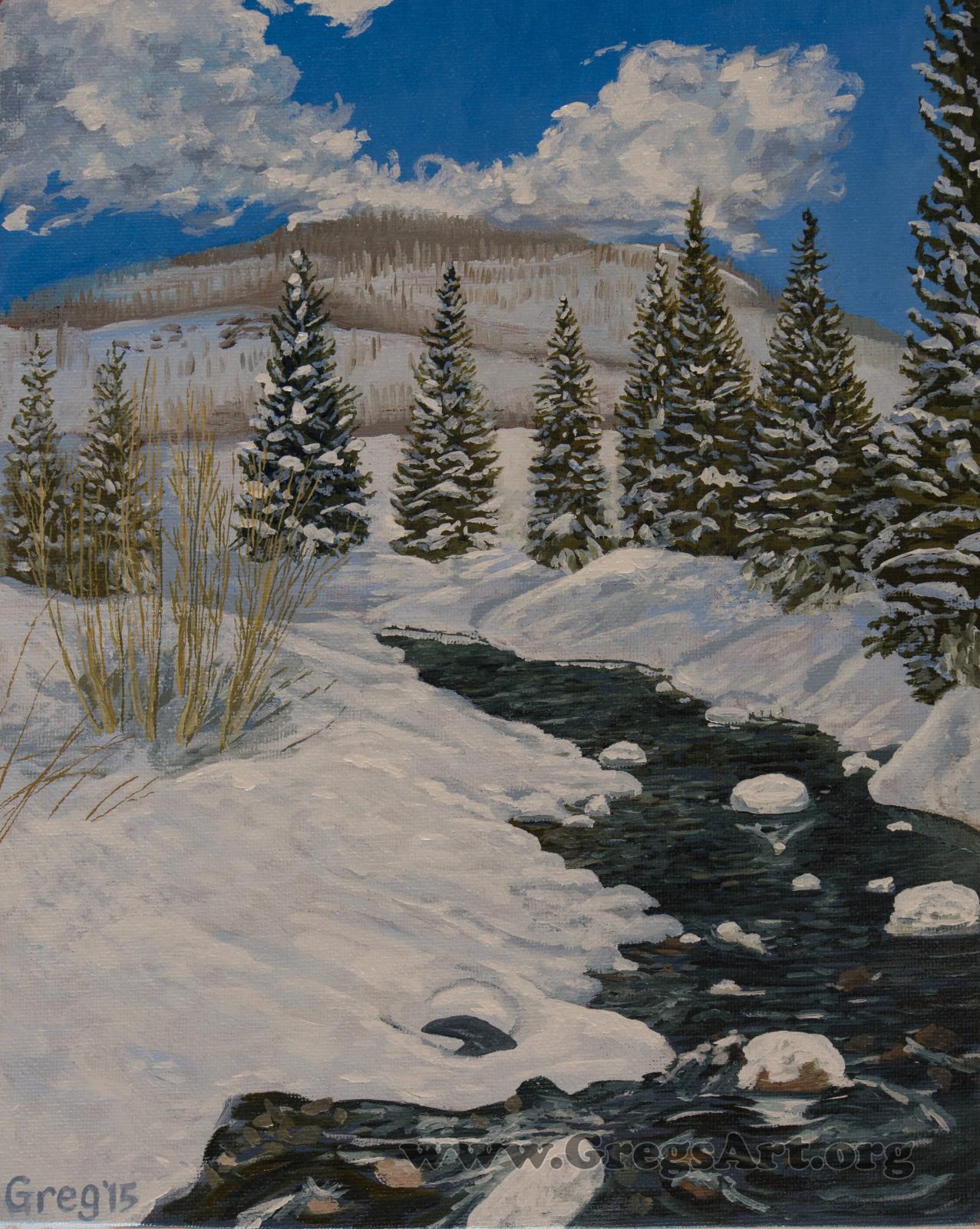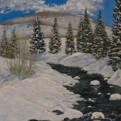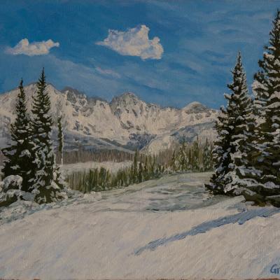 Winter for me is big bright blue skies and an almost complete blanket of unifying snow. It requires all the whites: titanium, flake and zinc white, and the big blues: ultramarine, cobalt and cerulean and, surprisingly, a lot of black and grey. My goal for a winter scene is to capture the positive feeling of the reflected sun and blues of the forever Colorado sky.