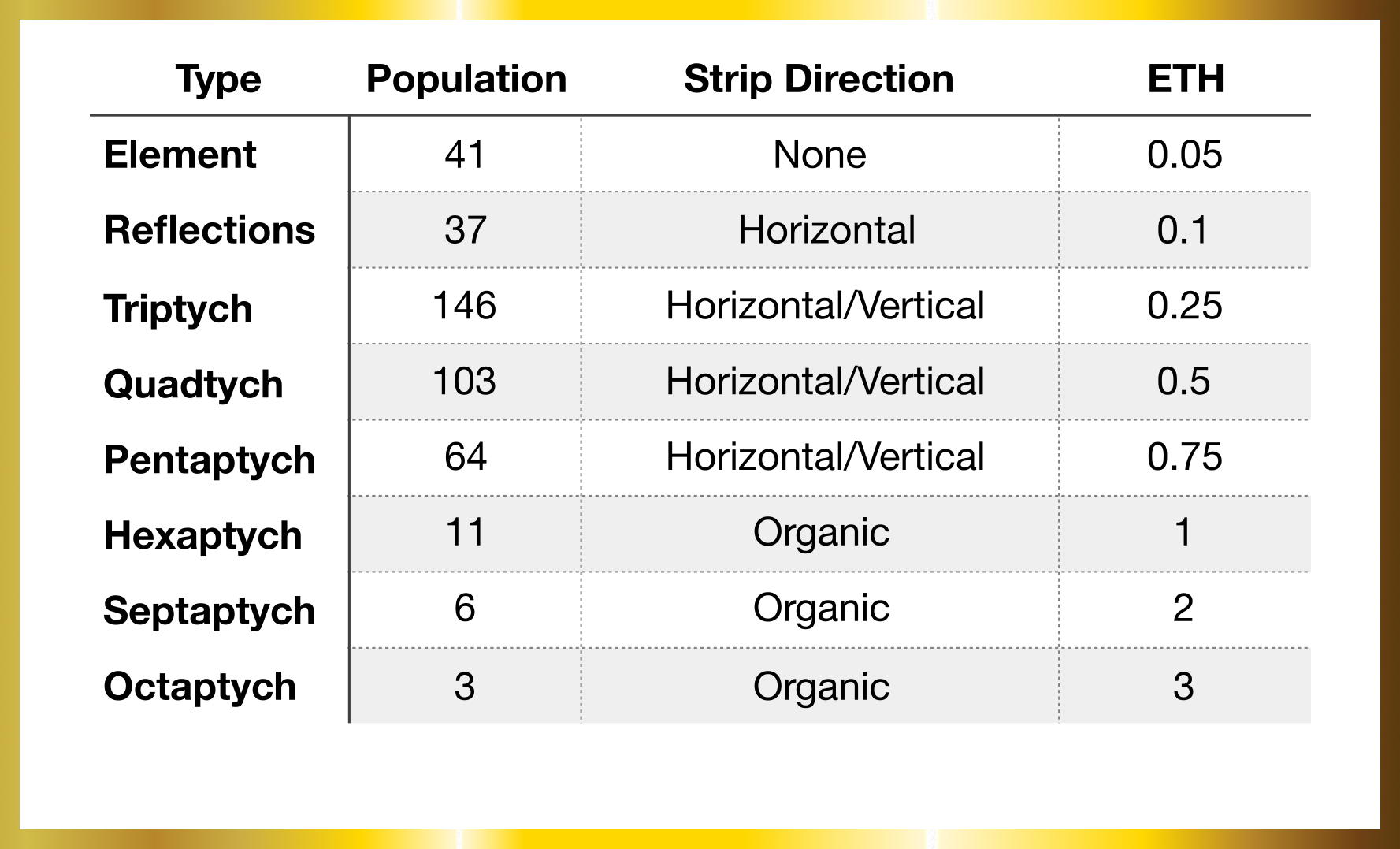The Strip Direction defines the orientation of the segments within each NFT: Horizontal, Vertical, or Organic. Elements marked as "none" are singular images without segmentation. Reflections exclusively utilize horizontal strips, whereas Triptychs, Quadtychs, and Pentaptychs can be either horizontal or vertical. Horizontal strips extend from top to bottom; vertical strips span from left to right. Organic strip direction allows the cutouts to be arranged in any direction, providing a dynamic and fluid composition. Only Hexaptychs, Septaptychs, and Octaptychs feature an organic strip direction.