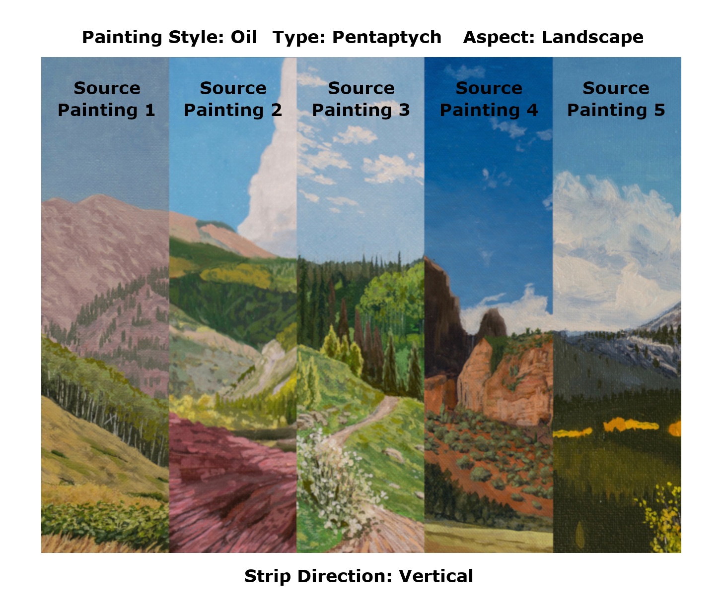 Pentaptych — A five-panel painting, often used for grand, complex narratives or highly structured compositions. Historically, pentaptychs were common in Gothic and Renaissance altarpieces. In contemporary art, some large-scale installations use the pentaptych structure for immersive storytelling. Strip Direction: Horizontal/Vertical