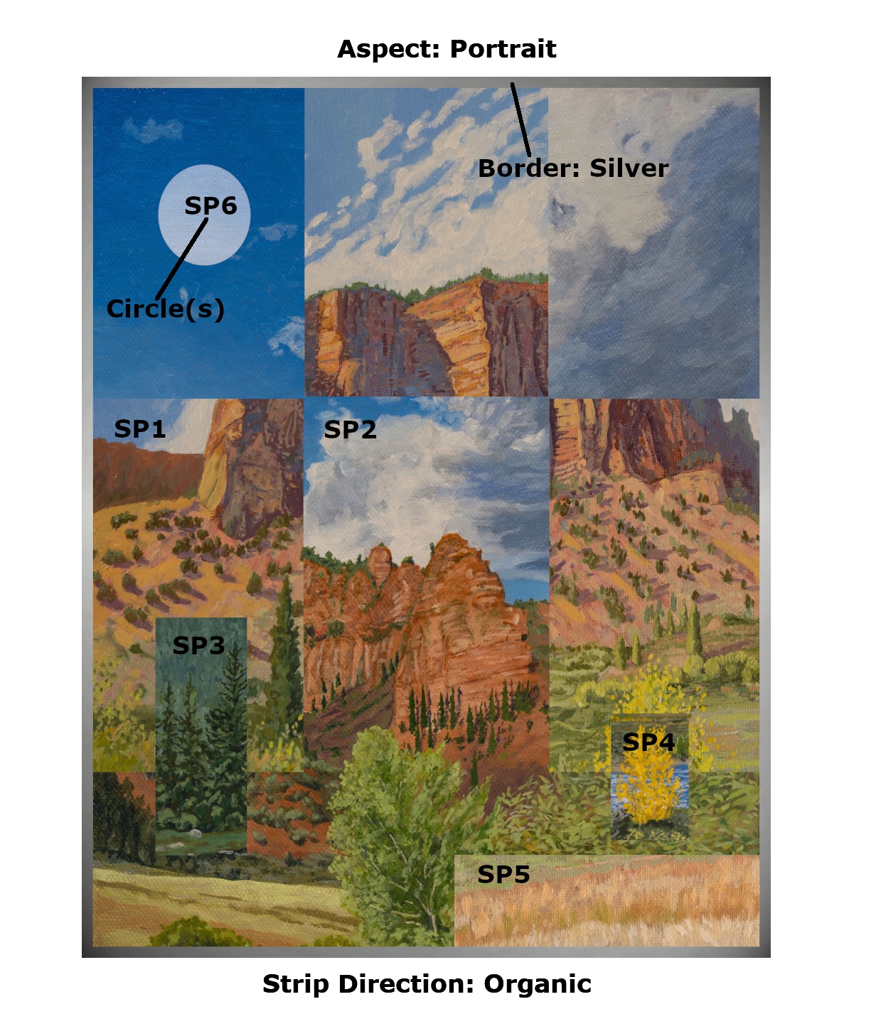Hexaptych — This image is constructed from six Elements and comprises 3% of the collection. The Elements can manifest as strips, rectangles, squares and circles. Strip Direction: Organic